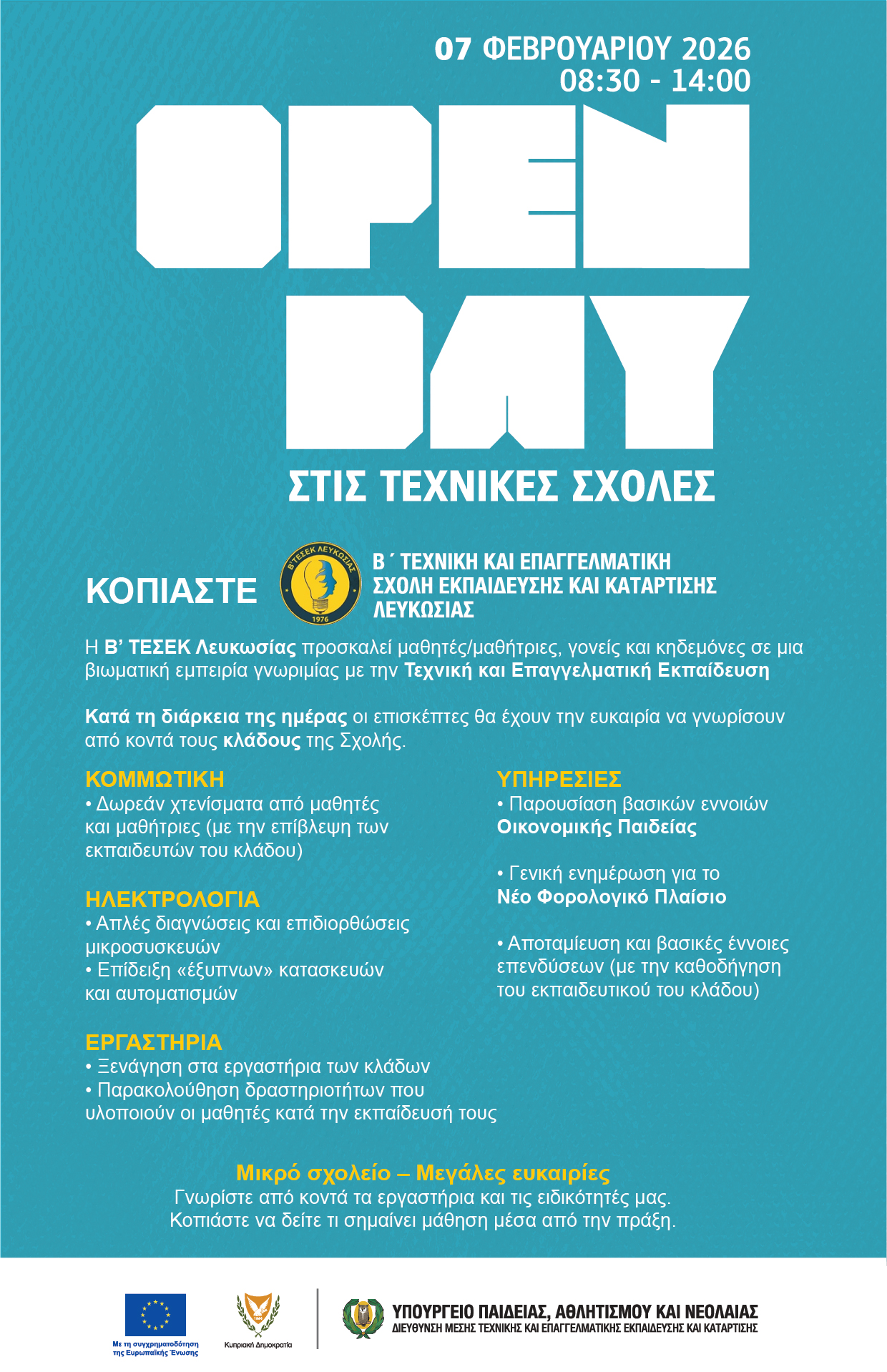 Πρόσκληση για ενημέρωση των μαθητών Α΄, Β΄ και Γ΄ τάξης Γυμνασιακού Κύκλου για τη δράση με τίτλο «Ημέρα Ανοικτού Σχολείου (OPEN DAY)» που διοργανώνει η ΔΜΤΕΕΚ σε όλες τις ΤΕΣΕΚ την 7η Φεβρουαρίου 2026