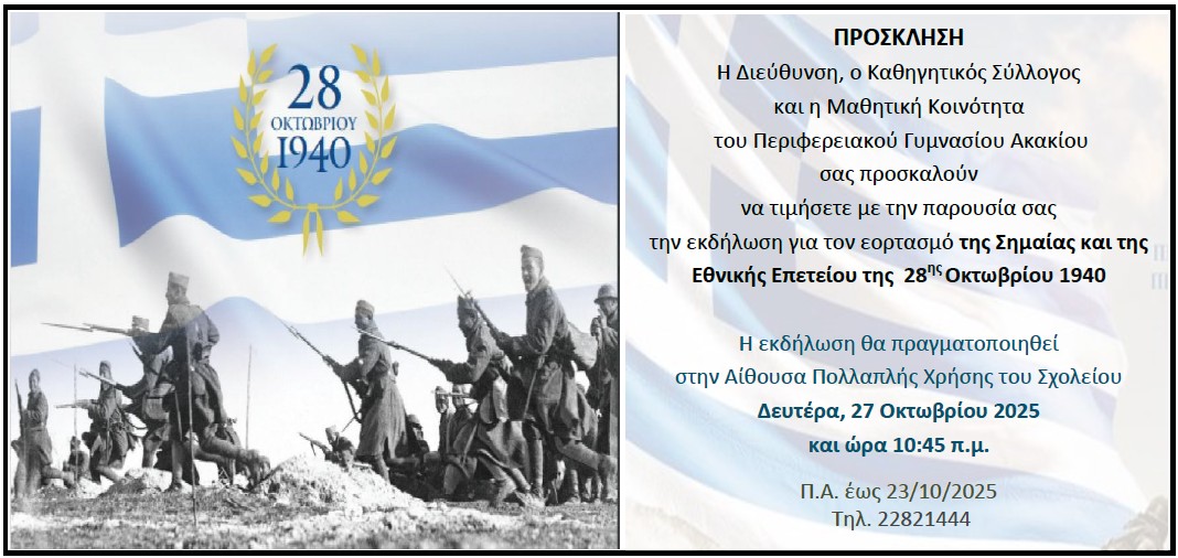 | Πρόσκληση για την εκδήλωση του εορτασμού της Σημαίας και της Εθνικής Επετείου της 28ης Οκτωβρίου 1940 | 23/10/2025 | |